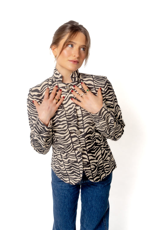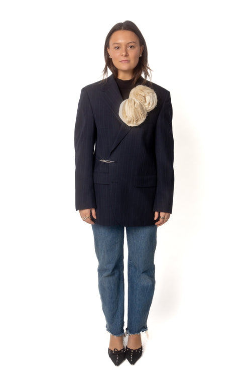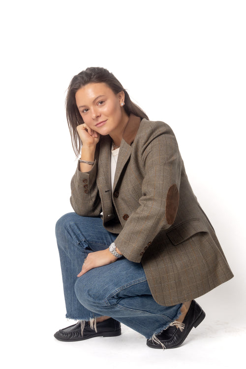 Named after one of my favorite quaint streets in one of my favorite cities, London, a place where I dream on spending my near future. The Sloane is preppy, but cool, and elevated as a plaid boxy-fitted blazer, with soft peplum detailed shoulders, that invite a chic and feminine edge. This plaid blazer has slight hues of blue, that is met with a deep navy silk blend lapel and edged sleeve.